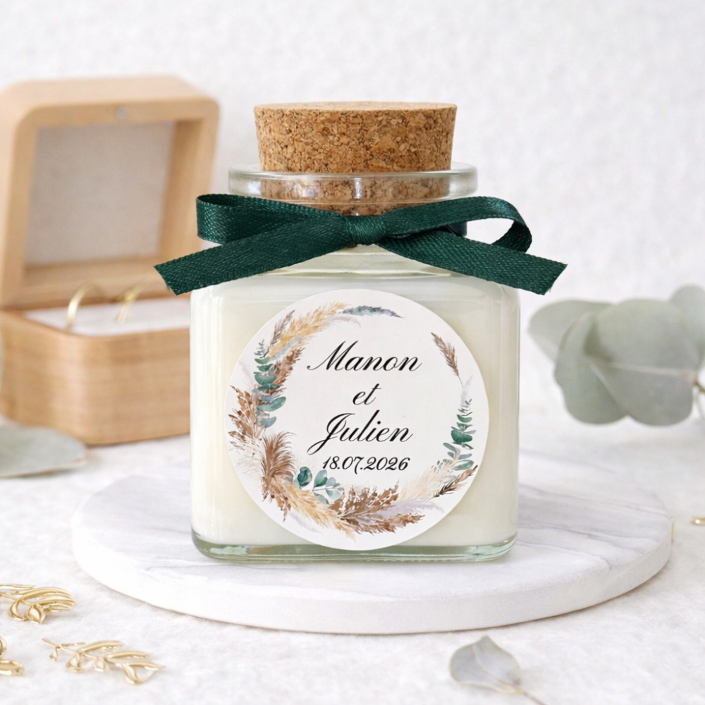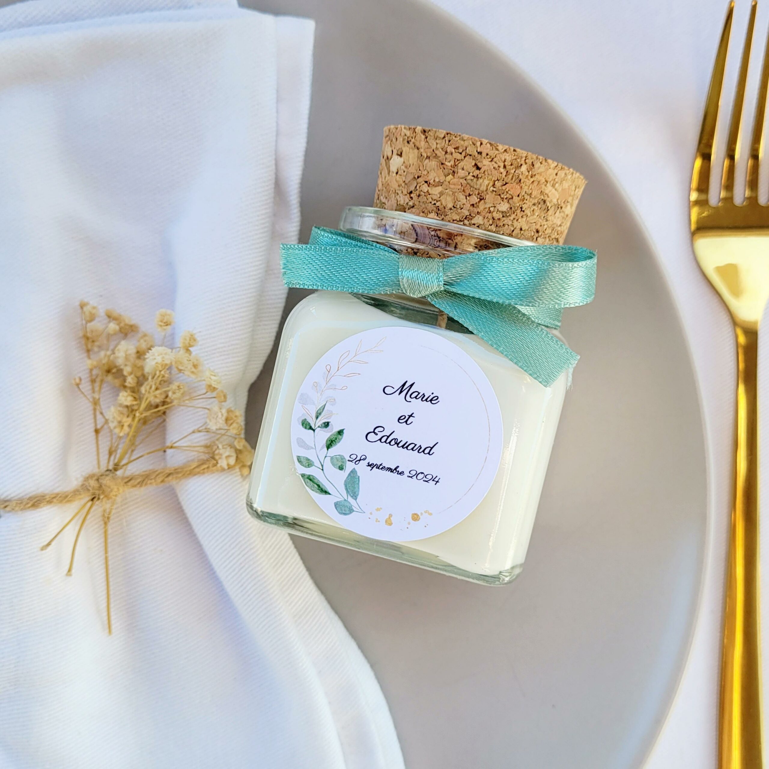 Faites de votre mariage un moment inoubliable en offrant cette bougie carrée personnalisée de 80 g. Élégante et raffinée, elle est présentée dans un pot en verre carré avec un bouchon en liège naturel qui lui donne un charme authentique. Avec de nombreuses options de personnalisation, cette bougie s’adapte à tous les styles et thématiques :