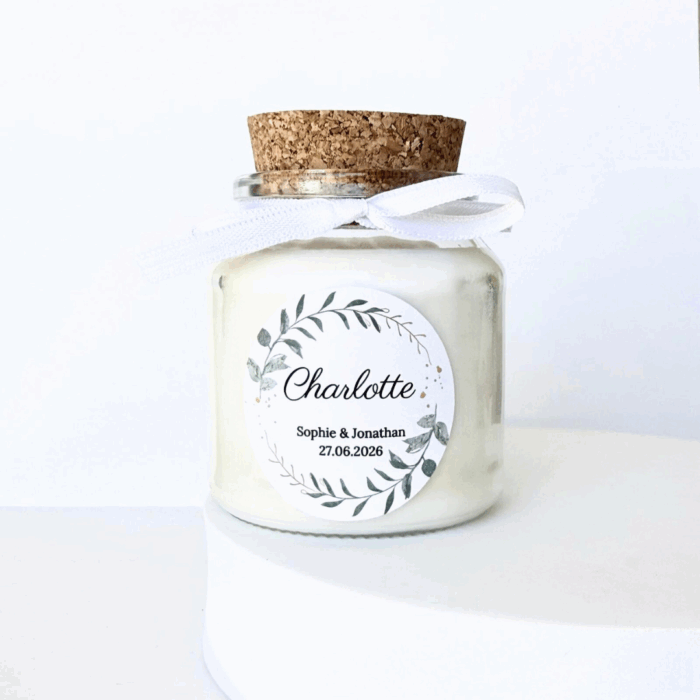 Avec sa grande capacité de 140 g, cette bougie ronde personnalisée est parfaite comme cadeau invité ou élément de décoration. Son bouchon en liège ajoute une touche naturelle qui convient à tous les styles, des mariages champêtres aux cérémonies modernes.